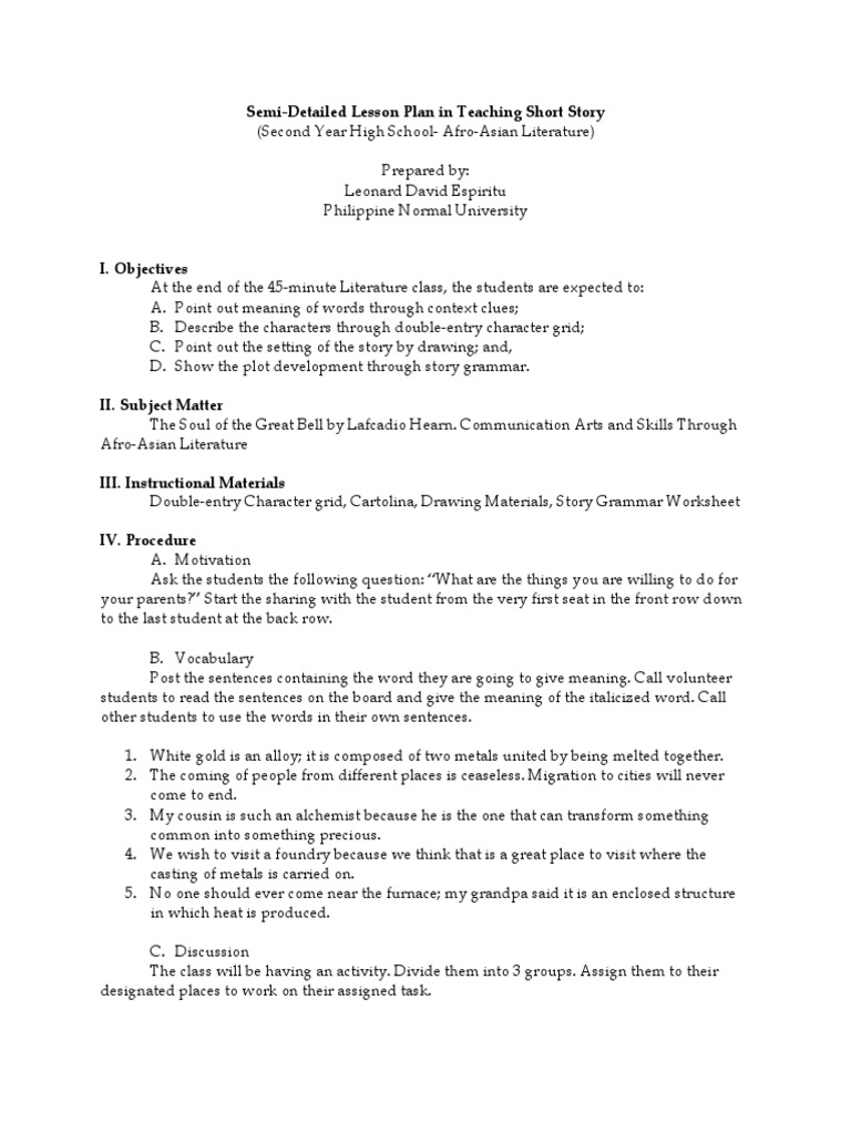 This semi-detailed lesson plan in teaching short story lesson plan has 1024 x 768 pixel and can be found at www.scribd.com